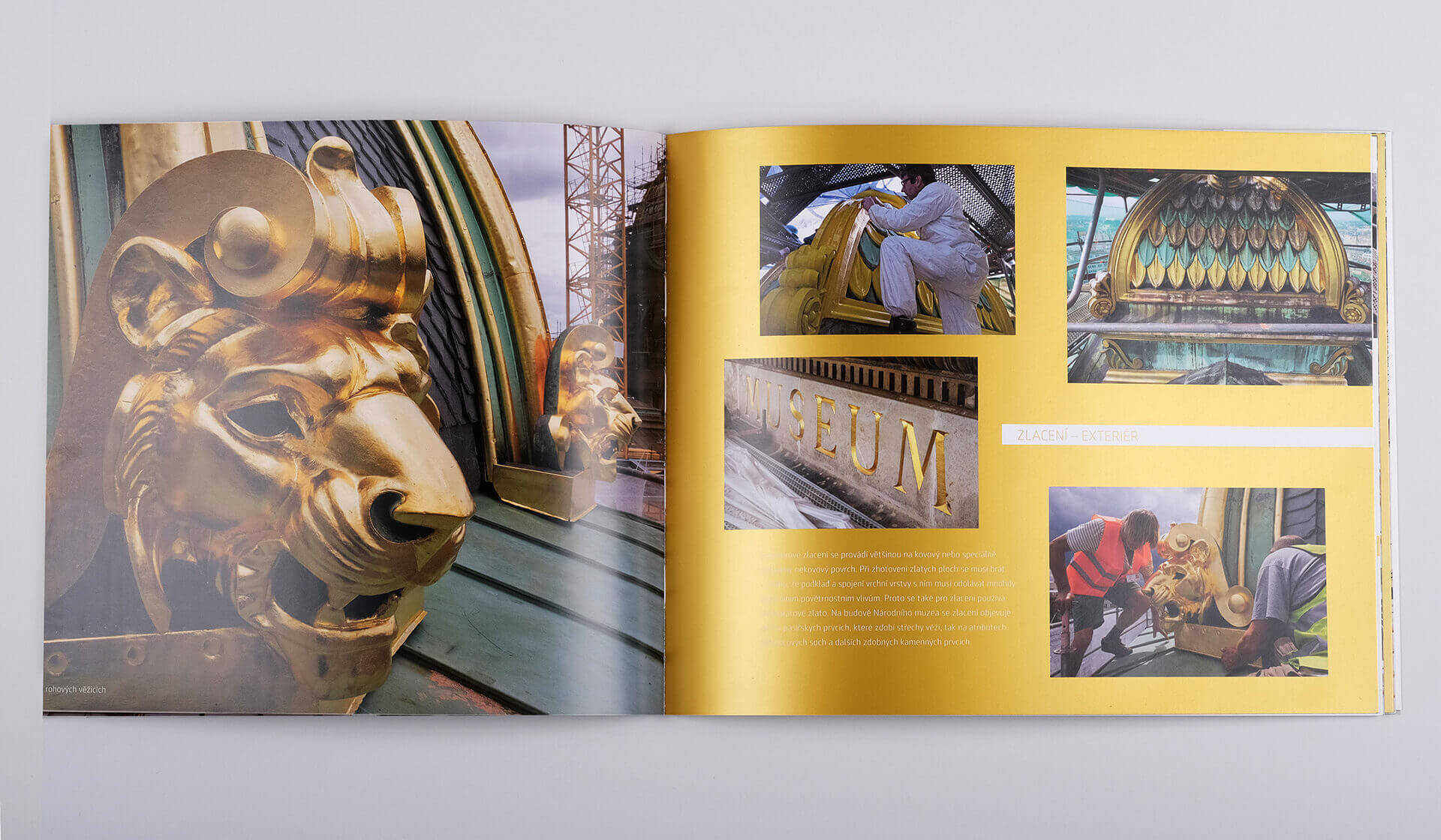 Pro společnost Metrostav jsme v rekordním čase vytvořili a vytiskli brožuru, která podrobně popisuje rekonstrukci Národního muzea. Publikace zachycuje různá řemesla využitá během rekonstrukce a nabízí detailní pohled na použité techniky a materiály. K tisku brožury byla vybrána metalická zlatá barva, reflektující zlacené detaily obnovené jak v interiéru, tak exteriéru této historické budovy.